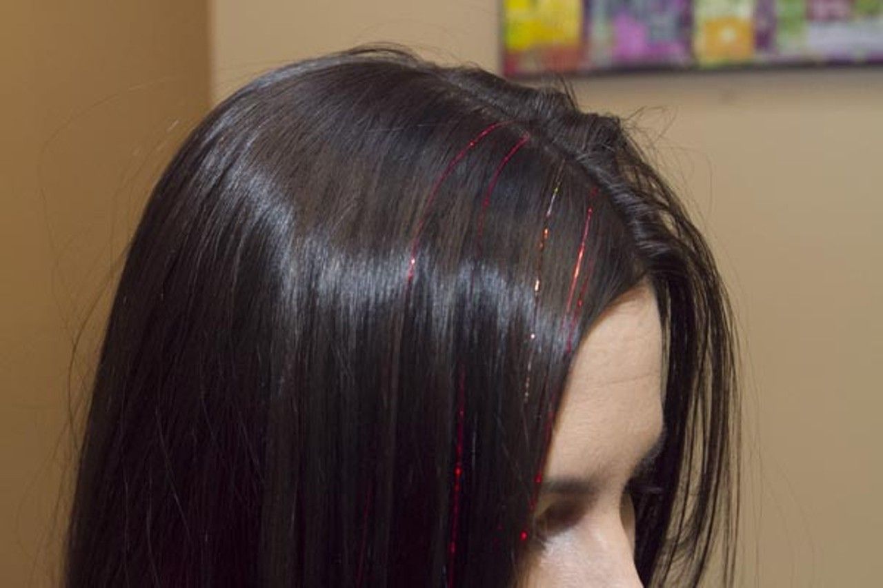 Our experienced stylists are quick, friendly, and skilled at applying tinsel safely and beautifully in just a few minutes per guest( depending on the number of strands)